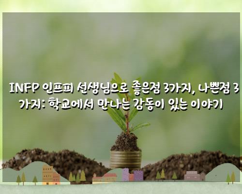 정리드린 내용은 INFP 인프피 선생님으로 좋은점 3가지, 나쁜점 3가지: 학교에서 만나는 감동이 있는 이야기 입니다. 찾으셨던분께 좋은 정보가 되었길바랍니다.